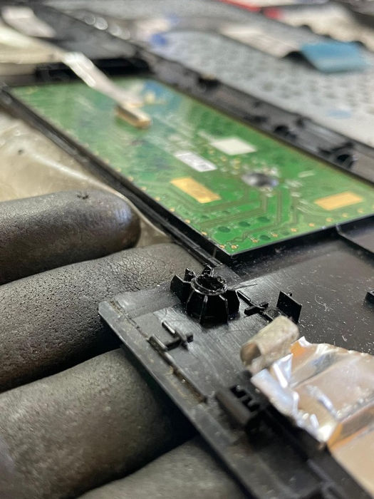 on screen back cover: screw holders were reinforced back in place, blocks were formed and spaces for cables remained. the body top & based were replaced, cracks & holes on both were patched & closed. at last, both hinges were adjusted ( not too tight & not too loose ) and missing bits were reformed.